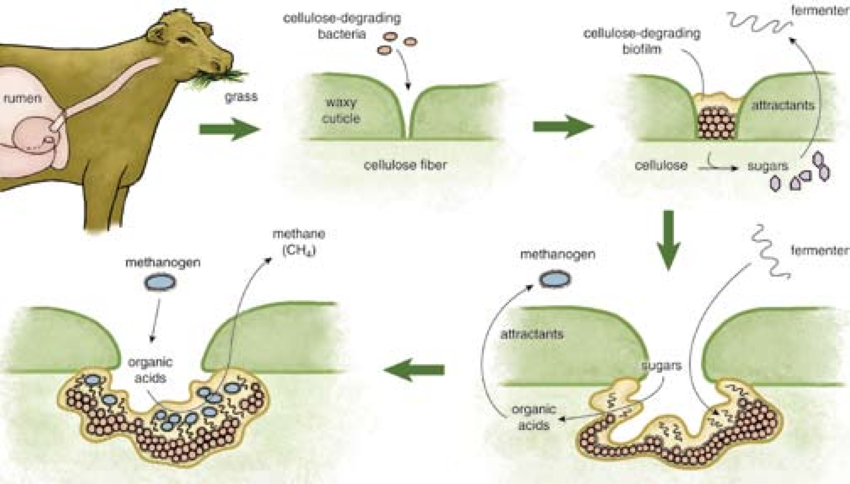 Microbes make ruminant protein, VFA, ammonia, Methane, and CO2 from basic materials. The movement, or wash, of microbial species from the reticulorumen into the omasum is a risk for all of them. They are protected for a while by their adhesion to feed particles and the rumen wall, but their contribution as 'meal' in the abomasum is significant. As previously stated, they play a critical role in supplying microbial protein to the host animal. Ruminants would not survive if microorganisms did not appear in the rumen of animals with similar physiology and structure.
